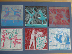 Es handelt sich um „Mehrfarben-Linolschnitte" zum Thema „Tanz", ca. je 21 x 21cm.