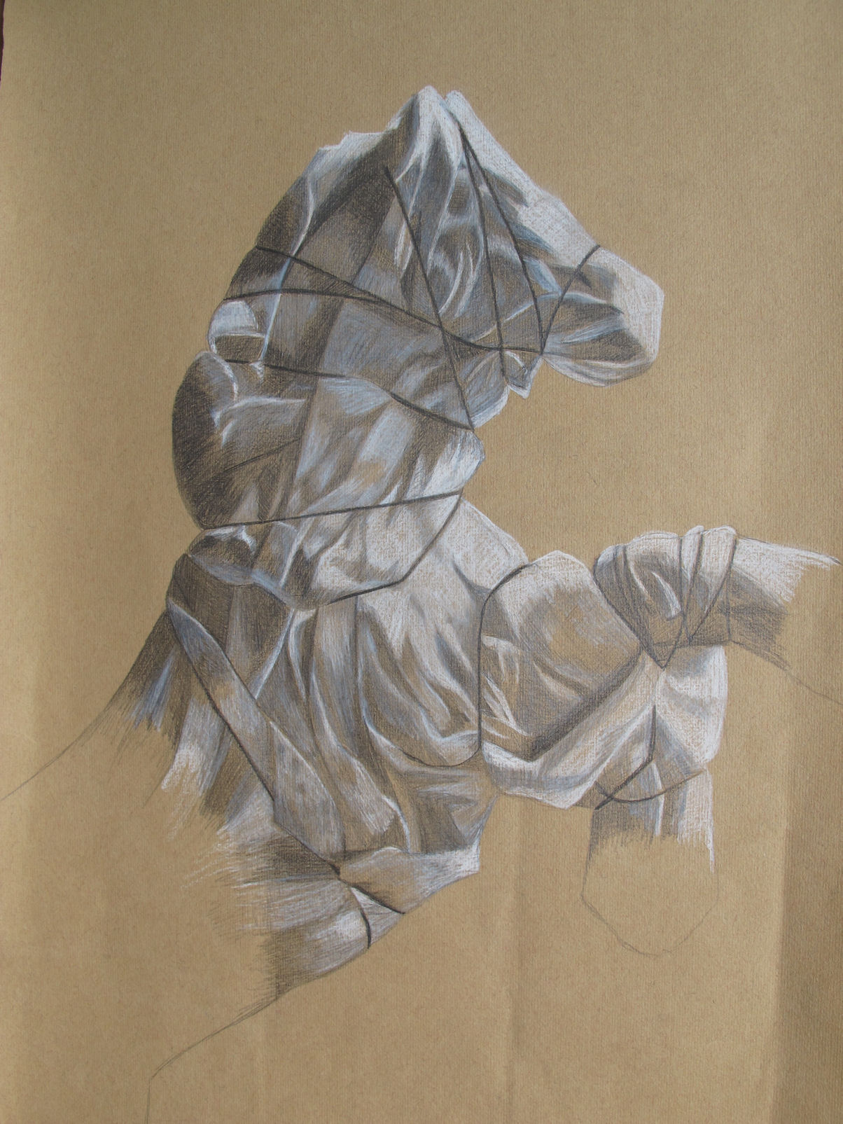 Pferd - Verpacktes Objekt, Bleistiftzeichnung auf dunklem Papier, weiß
