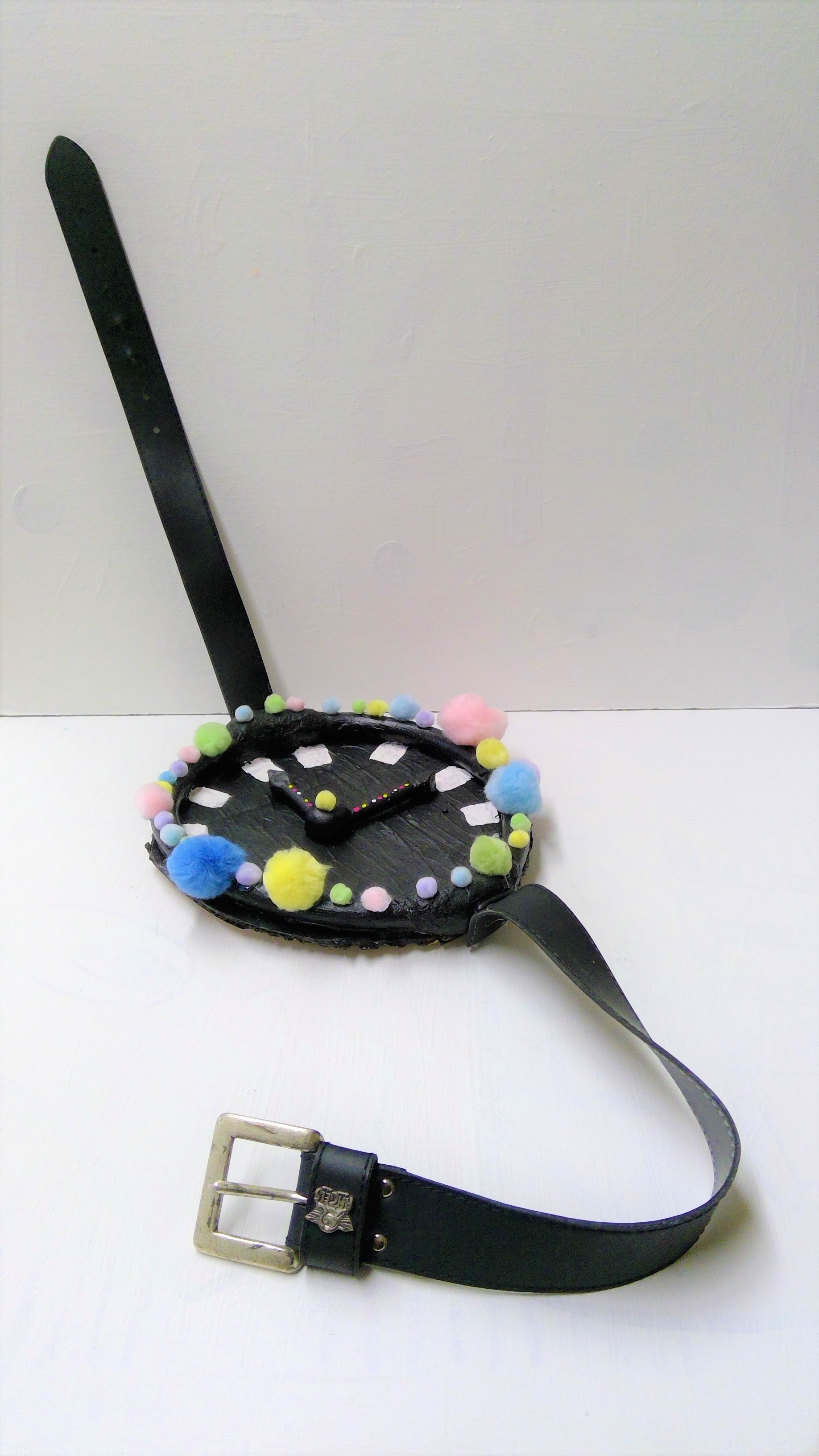 Uhr-Objekt aus Alltagsmaterialien; Gürtel, Gartenschlauch
