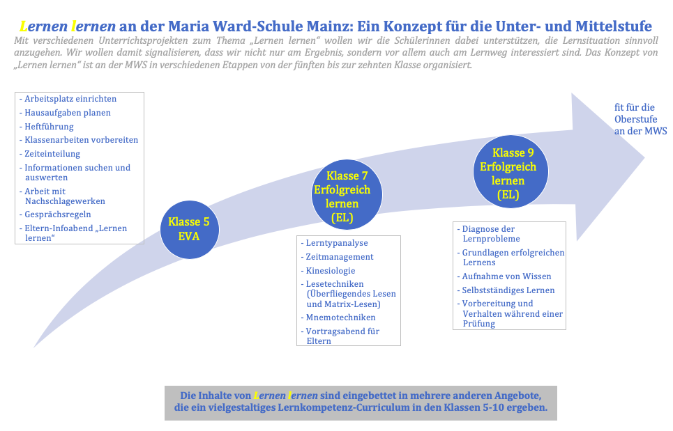 Speziell entwickelte und bewährte Konzepte, wie z.B. EVA und Erwachsen Werden in den Klassen 5 und 6, Kommunikations- und Methodentraining in den Jahrgängen 7 bzw. 11, zur Umsetzung dieses Ziels bauen in Orientierungs-, Mittel- oder Oberstufe aufeinander auf.