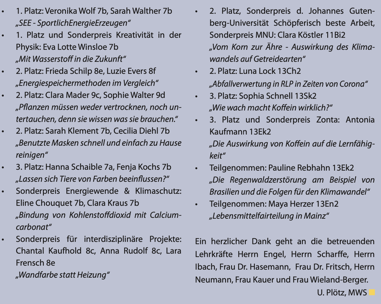 Die Schülerinnen der Maria Ward-Schule, betreut von den Lehrkräften Frau Dr. Hasemann, Frau Dr. Fritsch, Frau Wieland-Berger, Frau Kauer, Herr Neumann Herr Ibach, Herr Engel und Herr Scharffe, konnten beim diesjährigen "Jugend-Forscht" Wettbewerb wieder zahlreiche sehr gute Platzierungen erreichen. Dazu herzlichen Glückwunsche an die Schülerinnen und vielen Dank an die betreuenden Lehrkräfte.
